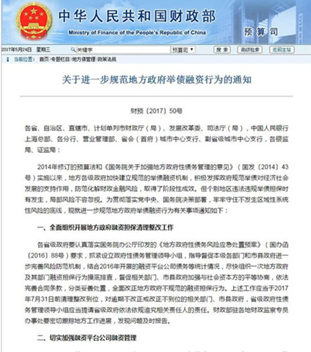 近日,财政部、发改委、司法部、央行、银监会等6部门发布《关于进一步规范地方政府举债融资行为的通知》(以下简称《通知》),进一步明确举债融资政策边界,规范地方政府举债融资行为,要求各地切实加强融资平台公司融资管理,规范政府与社会资本方的合作行为,建立跨部门联合监测和防控机制。