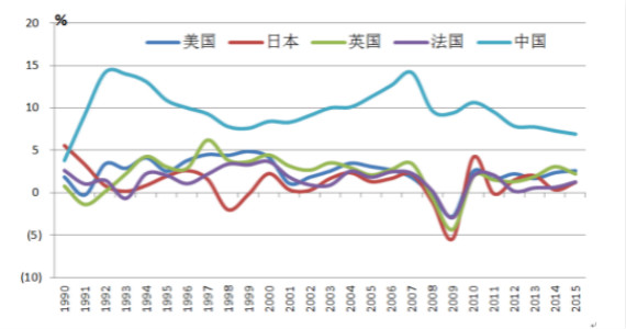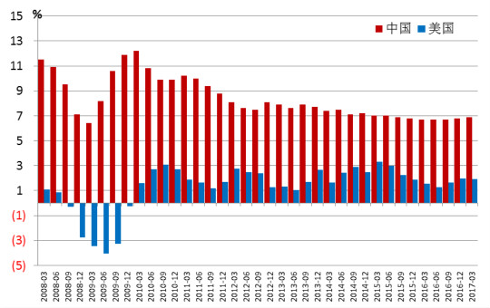 中国虽然进入结构调整转型升级的新常态,但是由于中国经济尚处于工业化后期阶段,中国经济一季度增速还是远高于刚刚发布的美国的一季度的1.9%的同比增速。