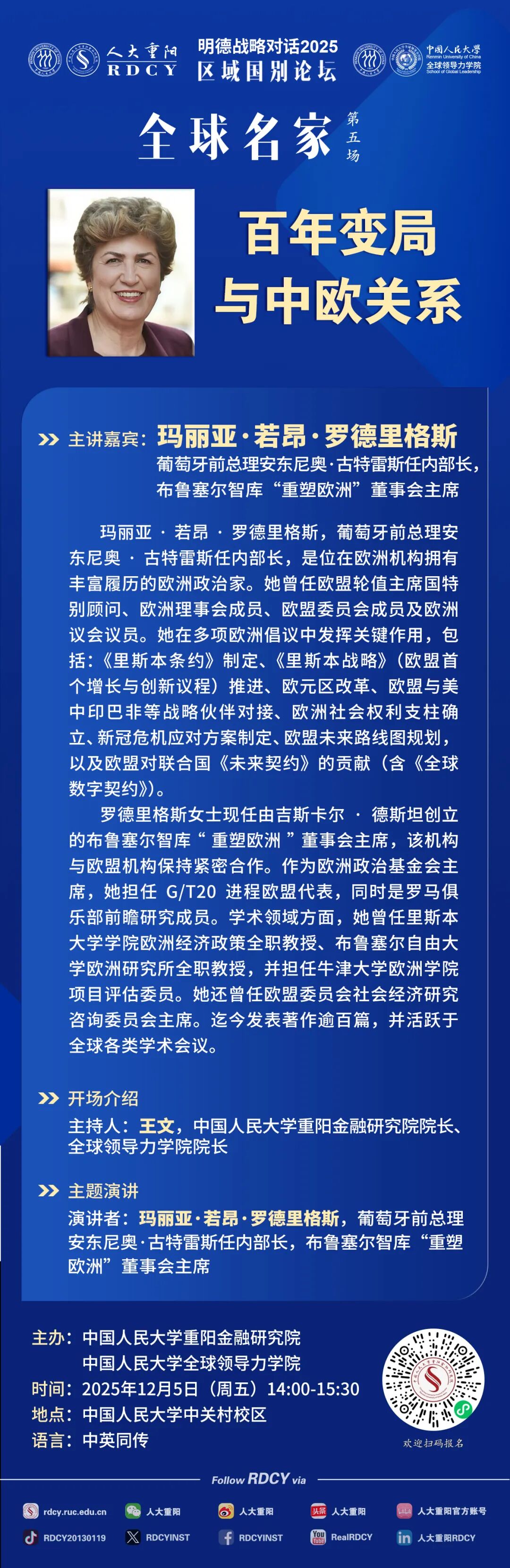 12月5日,葡萄牙前总理安东尼奥·古特雷斯任内部长、布鲁塞尔智库“重塑欧洲”董事会主席玛丽亚·若昂·罗德里格斯(Maria João Rodrigues)将做客人大重阳区域国别论坛之“全球名家系列”第五场,就“百年变局与中欧关系”主题发表演讲。