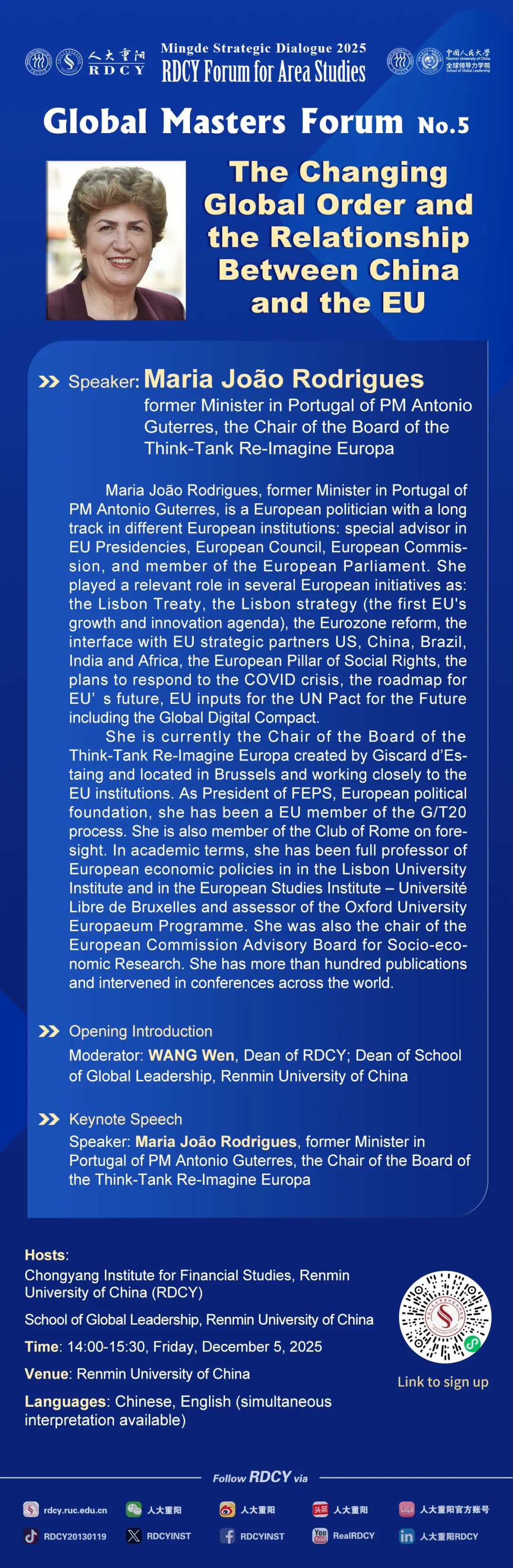 On December 5, Maria João Rodrigues, former Minister in Portugal of PM Antonio Guterres,the Chair of the Board of the Think-Tank Re-Imagine Europa, will speak at the 5th session of the Global Masters Forum under the Chongyang Institute for Financial Studies at Renmin University of China (RDCY) Forum for Area Studies.She will present on the topic “The changing global order and the relationship between China and the EU.” The agenda is as follows: