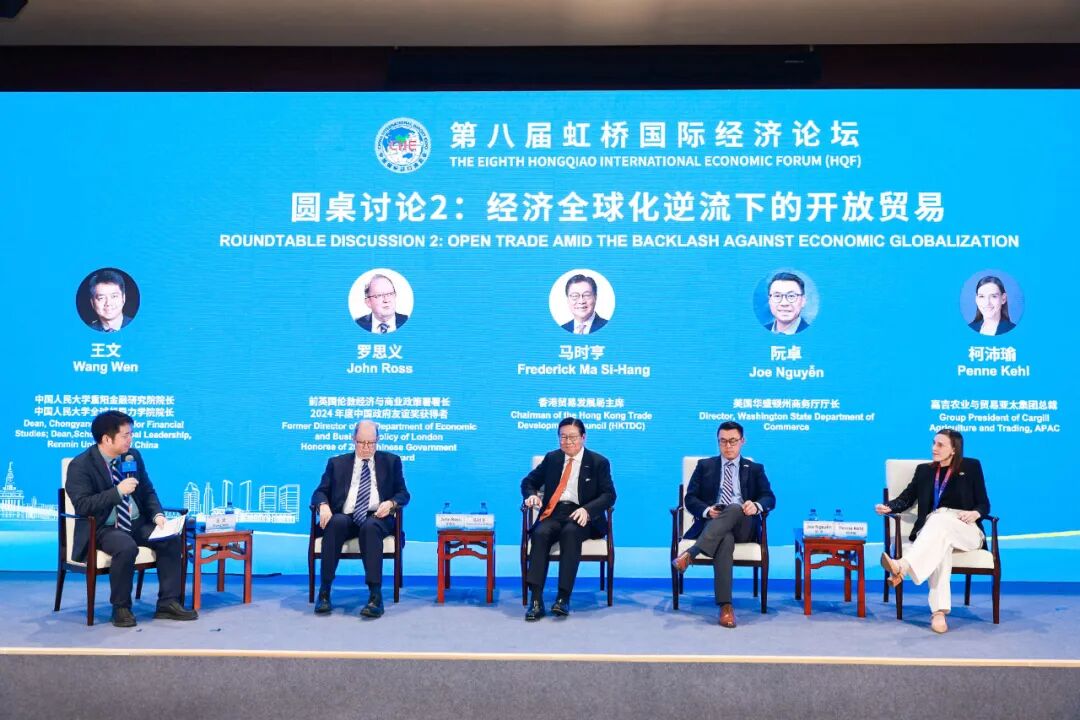 在圆桌讨论环节二,前英国伦敦经济与商业政策署署长、2024年度中国政府友谊奖获得者、中国人民大学重阳金融研究院高级研究员罗思义,香港贸易发展局主席马时亨,美国华盛顿州商务厅厅长阮卓,嘉吉农业与贸易亚太集团总裁柯沛瑜围绕“经济全球化逆流下的开放贸易”展开研讨。王文主持圆桌讨论环节二。